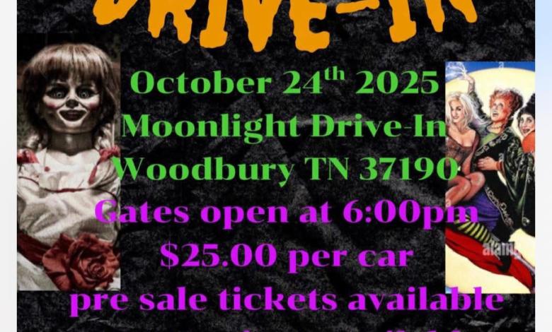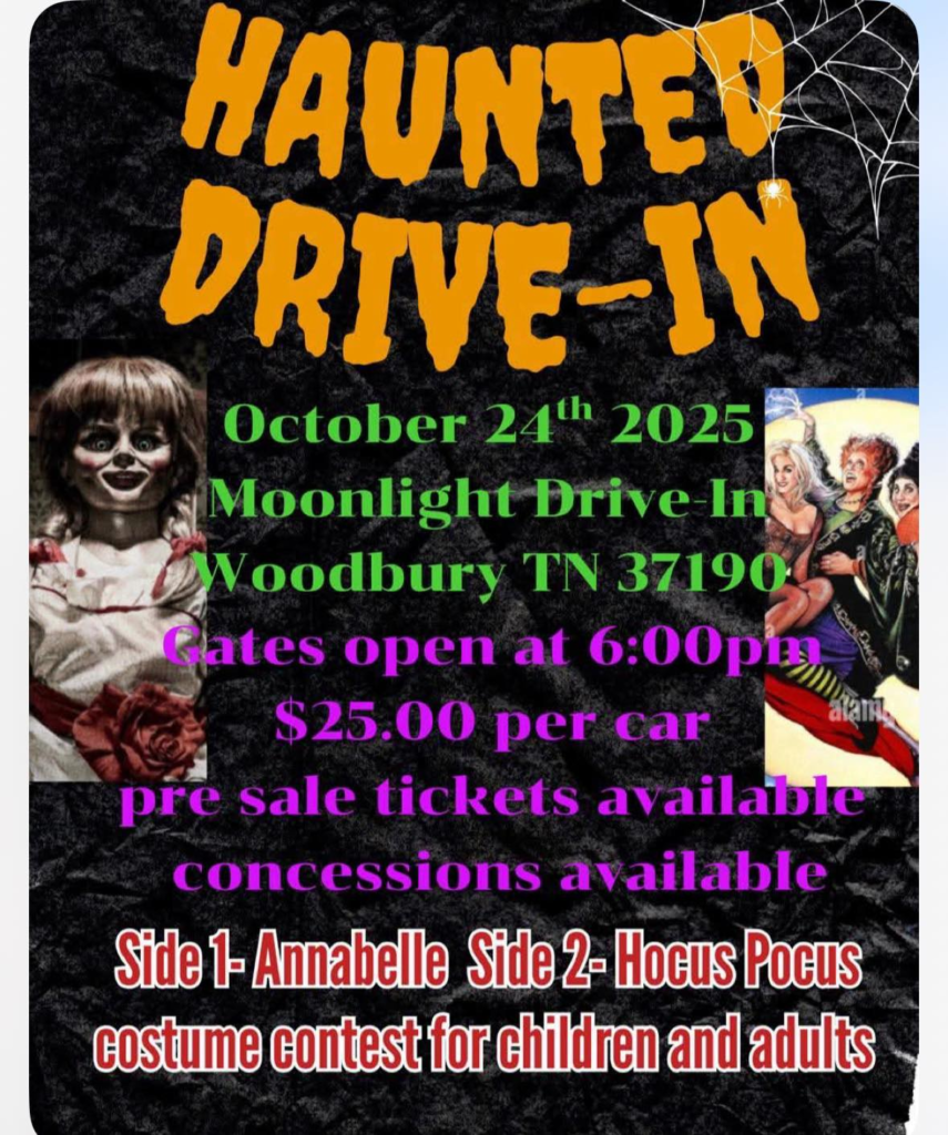 The Moonlite Drive In located in Woodbury TN is going haunted this Friday October 24th. Movies to be shown include on Screen One Annabelle and on Screen Two Hocus Pocus. A costume contest for children and adults will also be available.
